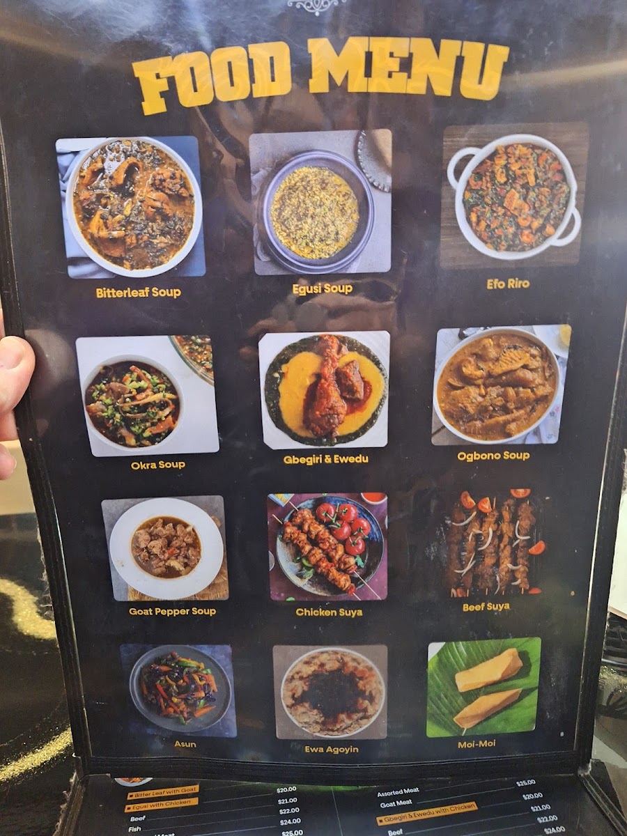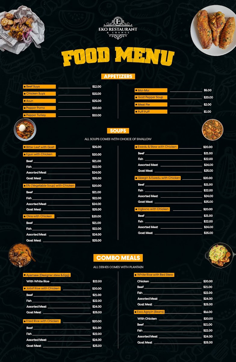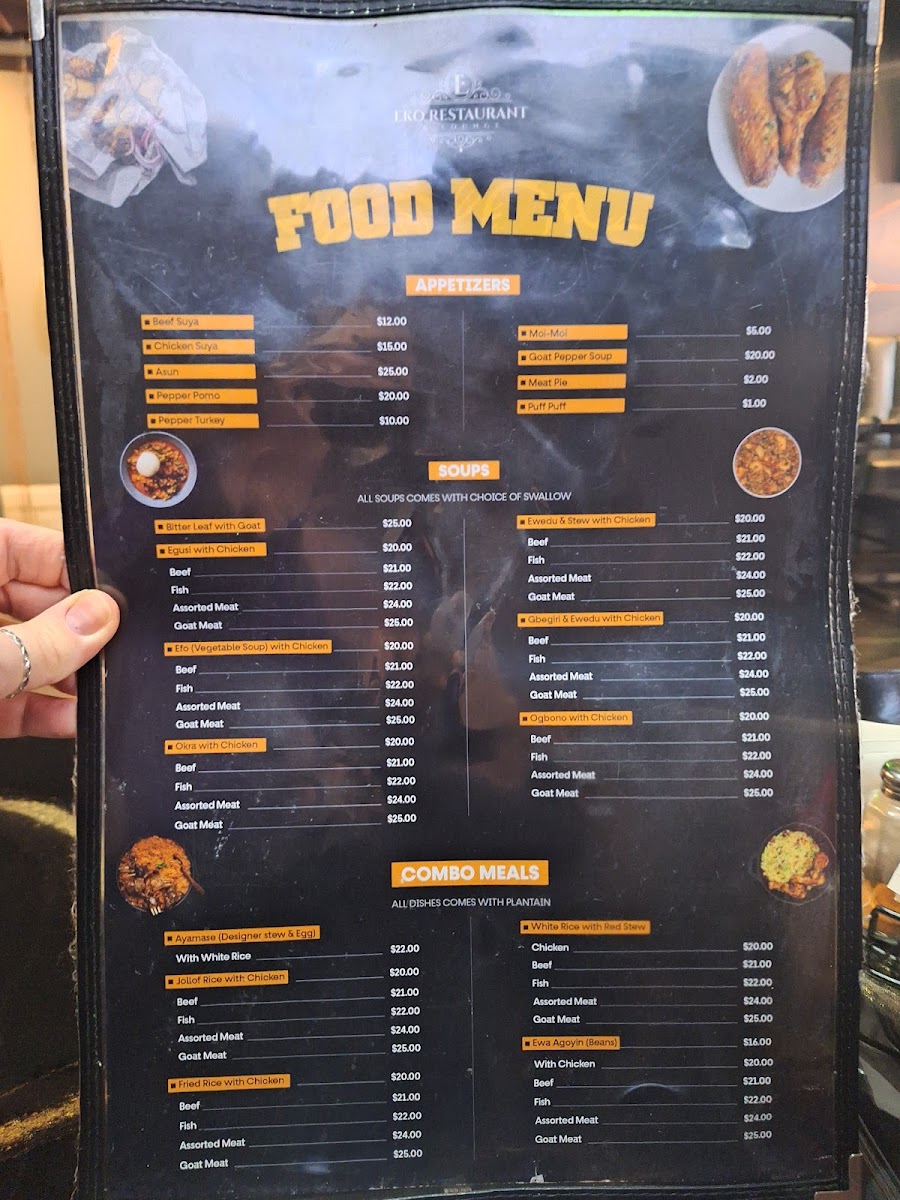 Eko African & Caribbean Market And Restaurant (486 Bell Rd, Nashville) keeps its menu focused and satisfying-built around bold West African flavors and hearty portions that feel like a true home-style feast. I like how the starters set the tone: Agege Bread, Beef Suya, Asun, Meat Pie, and Pepper Pomo give you everything from smoky, grilled spice to rich, savory bites that wake up your appetite fast. For building out your plate, the sides make it easy to customize-Fish, Assorted Meat, Chicken, Beef, and Jollof Rice Only let you mix and match depending on how heavy (or protein-packed) you want to go. The soup selection is where the kitchen really shows range, from Egusi With Assorted Meat to Bitter Leaf With Goat, plus comforting classics like Gbegiri & Ewedu With Goat Meat, Ewedu & Stew With Fish, and Efo (Vegetable Soup) With Assorted Meat-all the kind of dishes that taste like they’ve been simmered with patience and tradition. If you’re hungry-hungry, the combos are the most practical way to order, especially Fried Rice/Fish/Plantain, Fried Rice/Assorted Meat/Plantain, White Rice/Red Stew/Chicken/Plantain, Yam Porridge/Goat Meat, and Fried Rice/Beef/Plantain, which hit that perfect balance of comfort, spice, and value. To wash it down, the drink list covers both familiar and nostalgic picks like Maltina, Malta Guinness, Vita Malt Classic, Sprite, and Water, plus fruit-forward options such as Tropical Rhythms Island Mango, Tropical Rhythms Mango Carrot, and Tropical Rhythms Reggae Medley-and for something more grown-up, Orijin Bitters and Big Beer round it out nicely. Overall, it’s a menu that doesn’t try to do everything-just the right things, with flavor and authenticity leading the way.